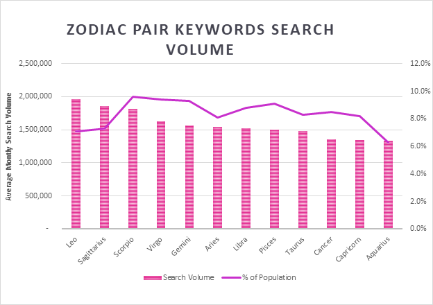 We also looked into the search behind each sign to see what other data we could reveal. Using zodiac population estimates we looked out for differences in the data and the uneven distribution of birthdays throughout the year (turns out there aren’t that many Aquariuses!)